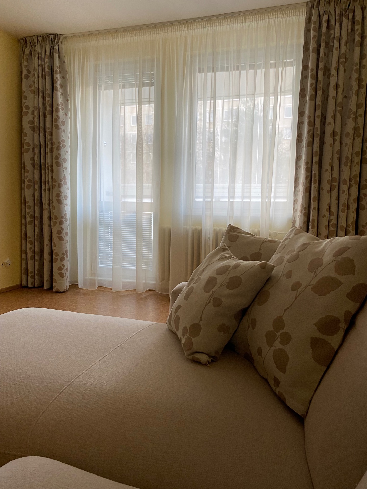 Závěsy, záclony, polštáře a dekorace na stůl v pražském bytě